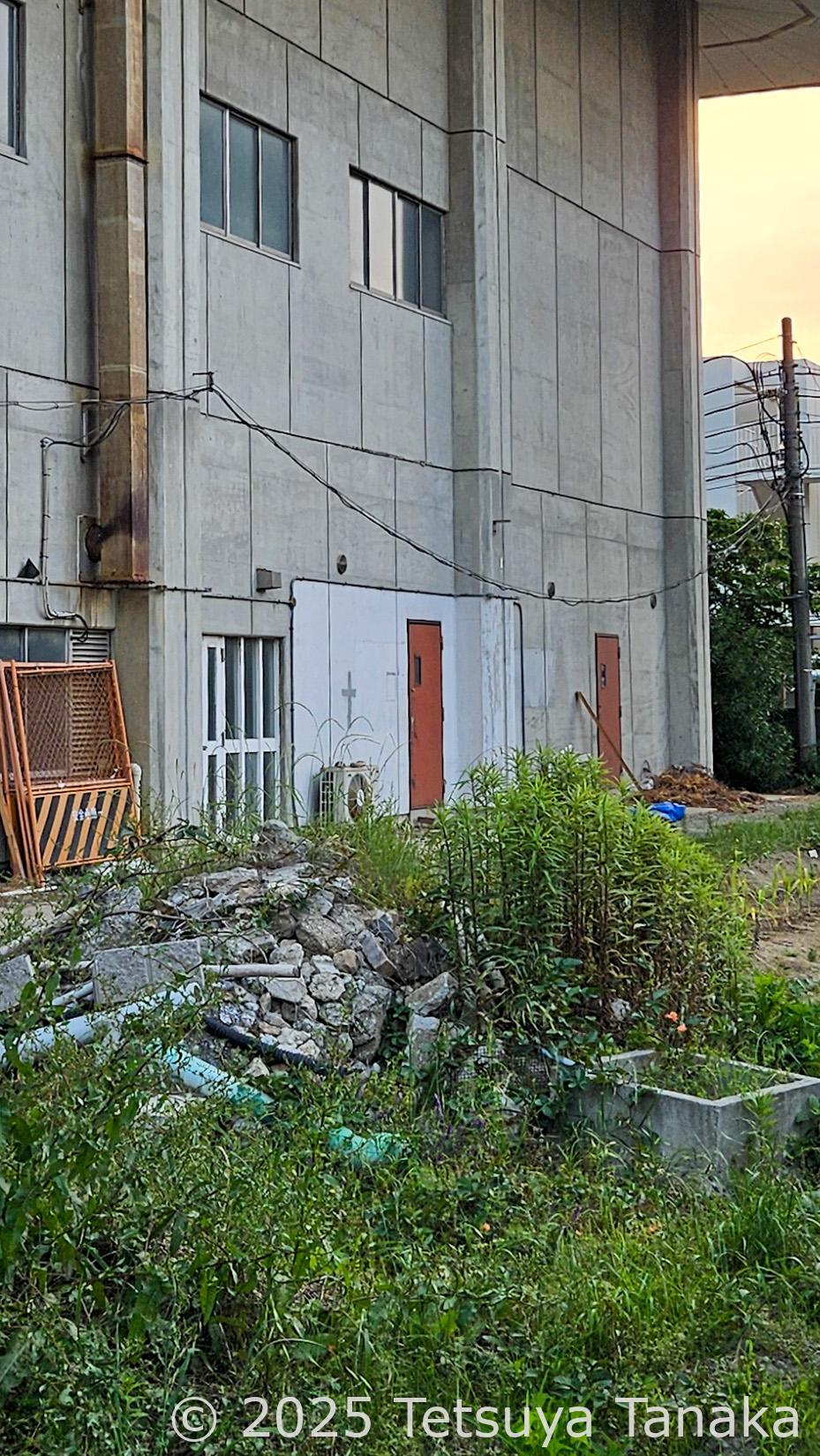 よく出入りしていた2005年あたりまでは、プレハブが2棟建っていたが、それらは取り壊され、何かの資材の残りと思しき残骸が貯水タンクの奥に雑多に置かれている。